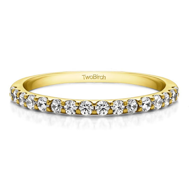 This wedding ring features 16 round prong set stones with a 2 millimeter wide band. The total combined carat weight of the ring is 0.48 carats. It has a high polish finish. This wedding ring weighs approximately 2.24 grams.