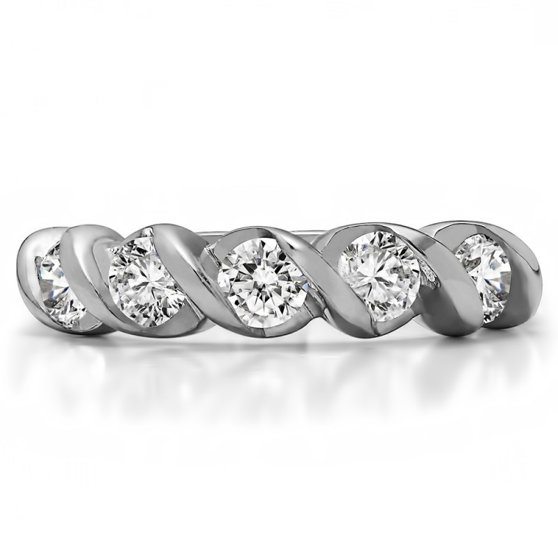 This wedding ring features 5 round bar set stones with a 2 millimeter wide band. The total combined carat weight of the ring is 0.48 carats. Each round stone is separated by a stunning swirl of high polished meal. This wedding ring weighs approximately 4.98 grams.