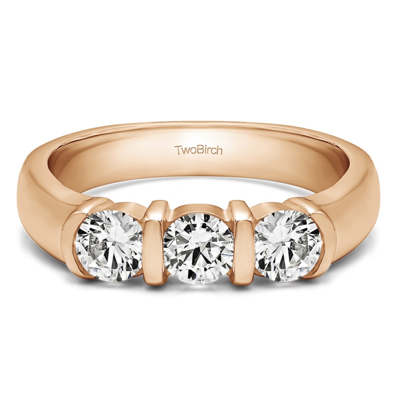 This wedding ring features 3 round bar set stones with a 2 millimeter wide band. The total combined carat weight of the ring is 0.48 carats. It features bar set round stones that are large enough to make it an anniversary band, worn on its own. This wedding ring weighs approximately 3.97 grams.