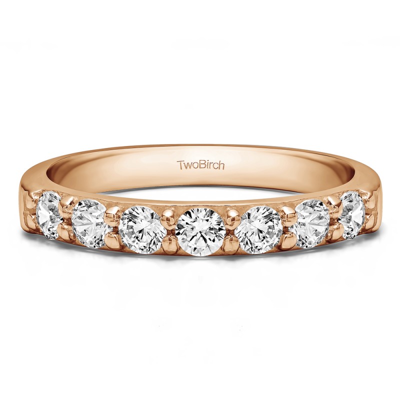 This wedding ring features 7 round prong set stones with a 2 millimeter wide band. The total combined carat weight of the ring is 0.49 carats. Round brilliant cut stones are set in common prongs, making it both stunning and secure. This wedding ring weighs approximately 4.79 grams.