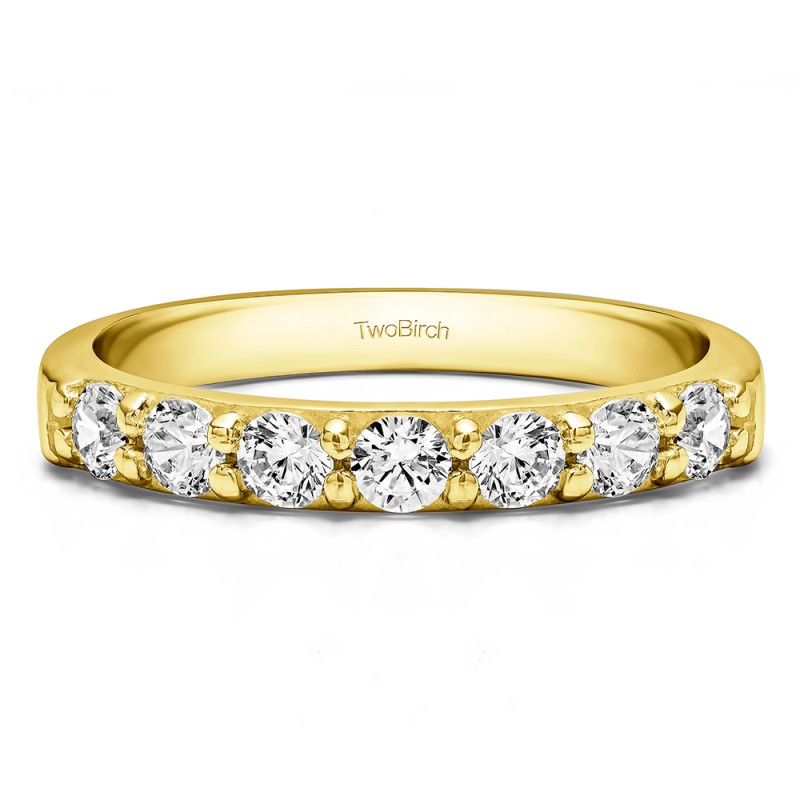 This wedding ring features 7 round prong set stones with a 2 millimeter wide band. The total combined carat weight of the ring is 0.49 carats. Round brilliant cut stones are set in common prongs, making it both stunning and secure. This wedding ring weighs approximately 4.79 grams.