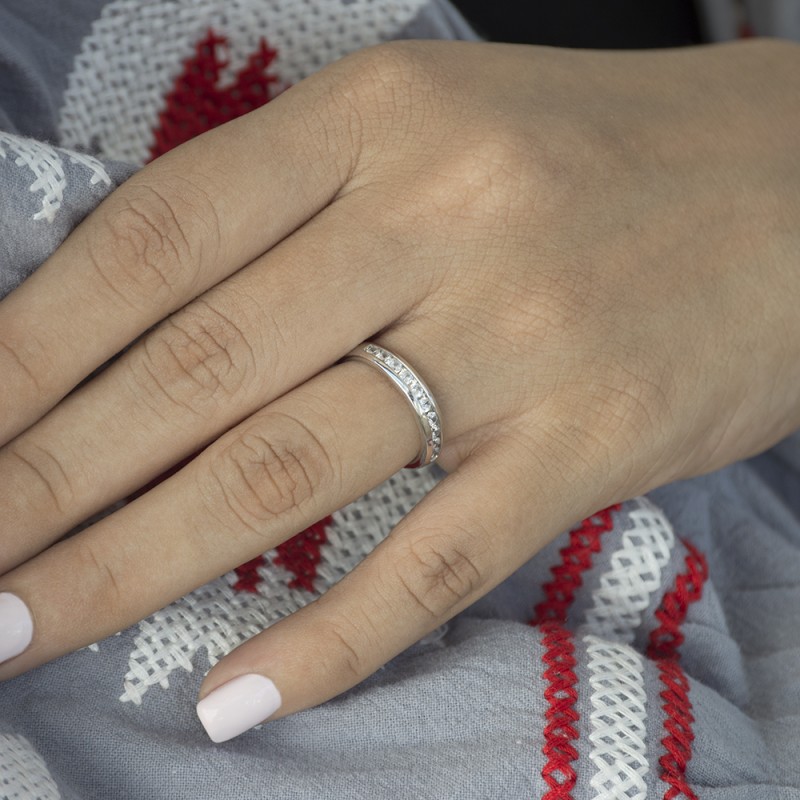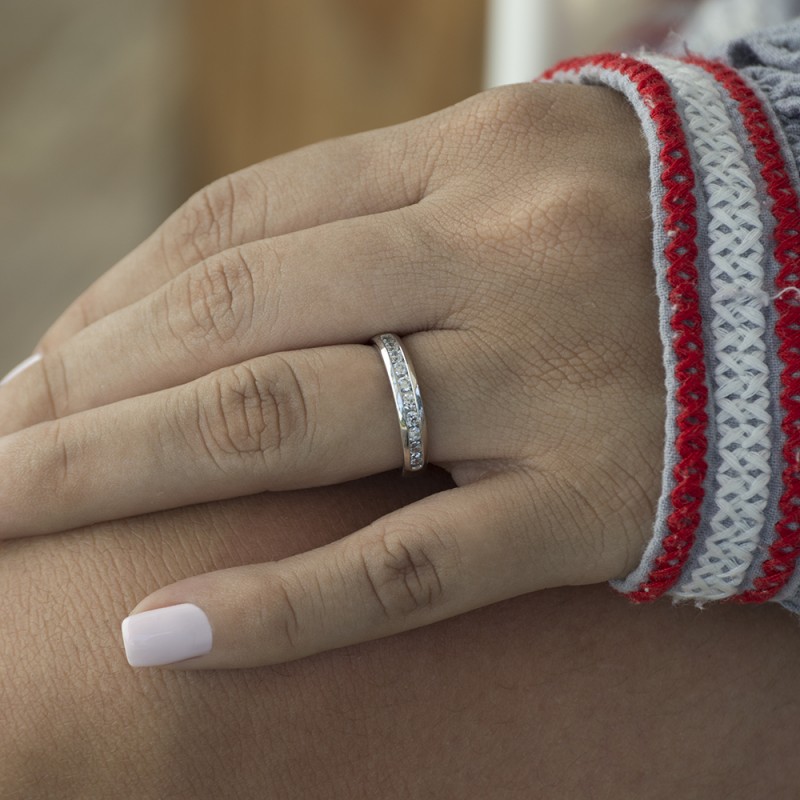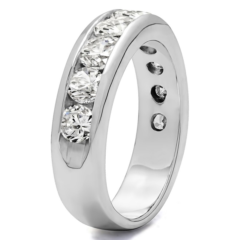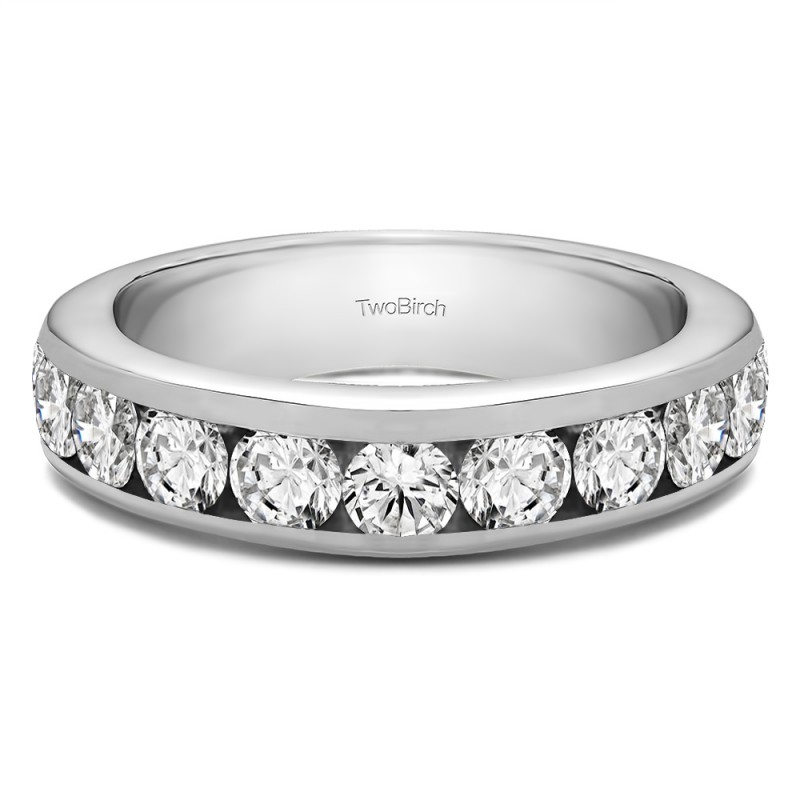 This wedding ring features 10 round channel set stones with a 2 millimeter wide band. The total combined carat weight of the ring is 0.5 carats. It has a high polish finish. This wedding ring weighs approximately 4.95 grams.