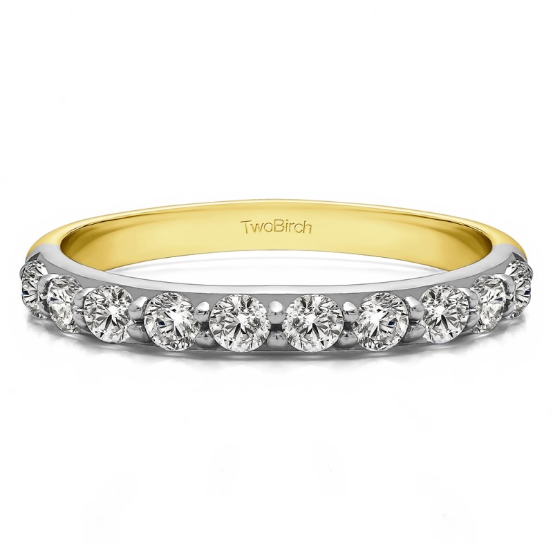 This wedding ring features 10 round prong set stones with a 2 millimeter wide band. The total combined carat weight of the ring is 0.5 carats. It has shared prongs, set low, making it perfect to wear on its own or to accompany any style engagement ring. This wedding ring weighs approximately 4.16 grams.