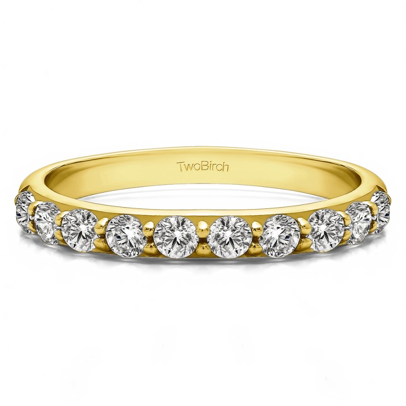 This wedding ring features 10 round prong set stones with a 2 millimeter wide band. The total combined carat weight of the ring is 0.5 carats. It has shared prongs, set low, making it perfect to wear on its own or to accompany any style engagement ring. This wedding ring weighs approximately 4.16 grams.