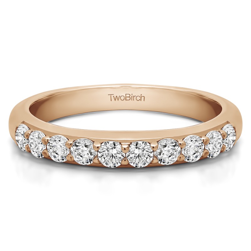 This wedding ring features 10 round prong set stones with a 2 millimeter wide band. The total combined carat weight of the ring is 0.5 carats. It has a low profile making it perfect to fit with any style of engagement ring. This wedding ring weighs approximately 3.91 grams.