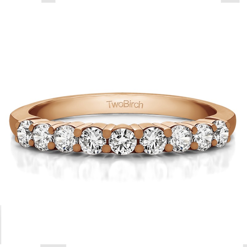 This wedding ring features 9 round prong set stones with a 2 millimeter wide band. The total combined carat weight of the ring is 0.5 carats. It features a double row of shared prong set round stones. This wedding ring weighs approximately 2.87 grams.