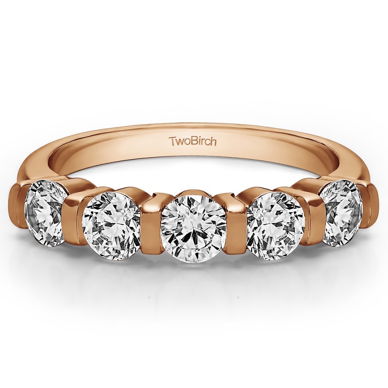 This wedding ring features 5 round bar set stones with a 2 millimeter wide band. The total combined carat weight of the ring is 0.5 carats. Stones are set in a high polished bar, giving it both stability and grace. This wedding ring weighs approximately 3.03 grams.