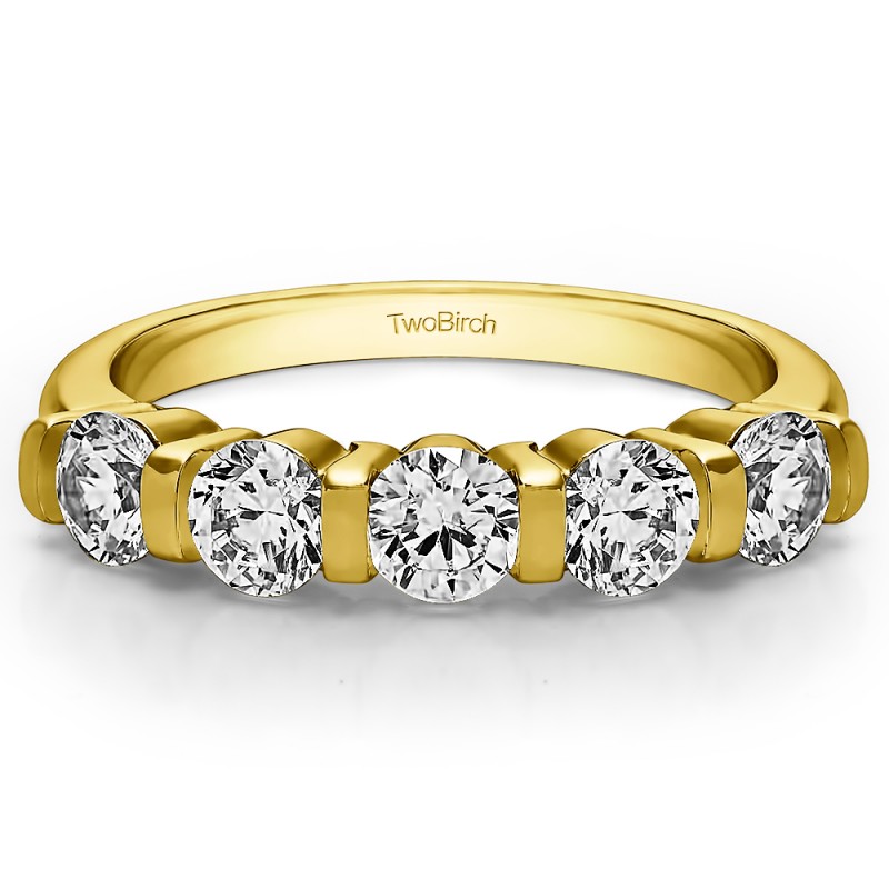 This wedding ring features 5 round bar set stones with a 2 millimeter wide band. The total combined carat weight of the ring is 0.5 carats. Stones are set in a high polished bar, giving it both stability and grace. This wedding ring weighs approximately 3.03 grams.