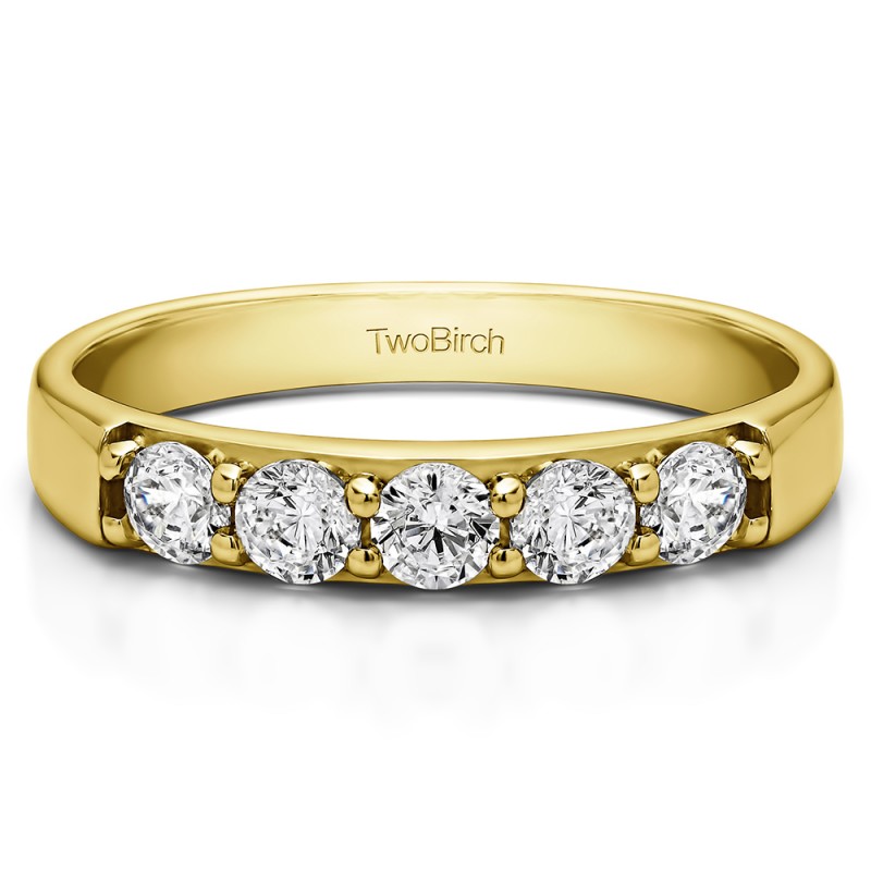 This wedding ring features 5 round prong set stones with a 2 millimeter wide band. The total combined carat weight of the ring is 0.5 carats. Stones in this wedding ring are set low, making it a perfect match for most engagement rings. It is also wide enough to be worn on its own, without any engagement ring. This wedding ring weighs approximately 4.81 grams.