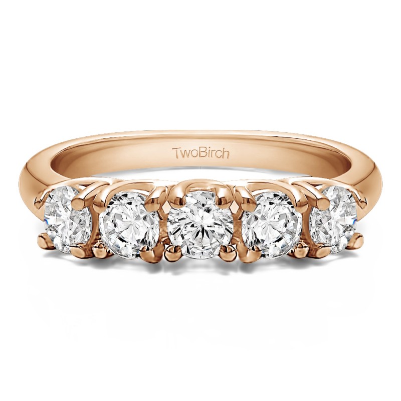 This wedding ring features 5 round prong set stones with a 2 millimeter wide band. The total combined carat weight of the ring is 0.5 carats. From the top, this wedding ring appears to be a traditional five stone wedding ring, set with shared prongs. From the profile view, the ring has a very unique trellis style setting. This wedding ring weighs approximately 4.75 grams.