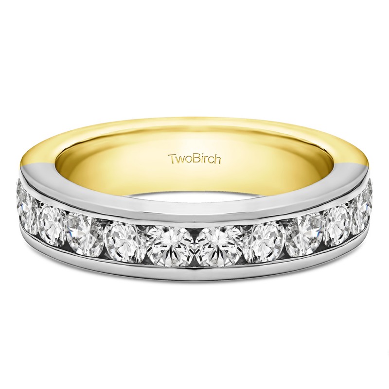 This wedding ring features 12 round channel set stones with a 2 millimeter wide band. The total combined carat weight of the ring is 0.5 carats. It has a high polish finish. This wedding ring weighs approximately 3.52 grams.