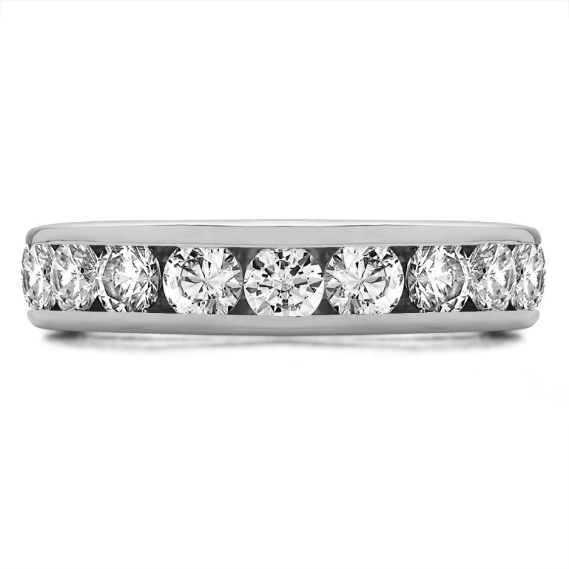 This wedding ring features 10 round channel set stones with a 2 millimeter wide band. The total combined carat weight of the ring is 0.75 carats. It has a high polish finish. This wedding ring weighs approximately 5.21 grams.