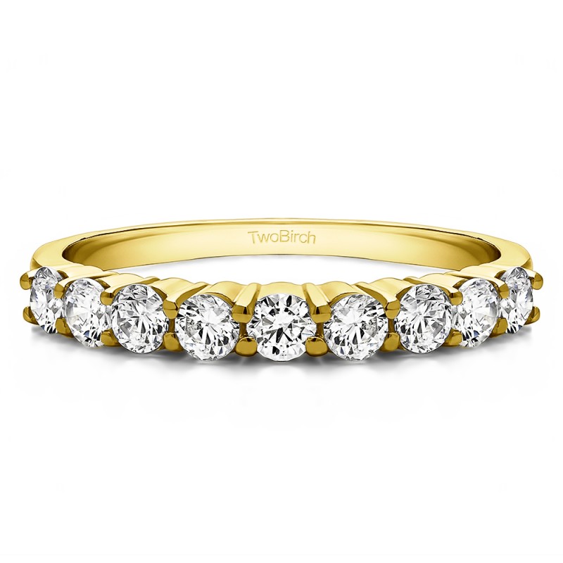 This wedding ring features 9 round prong set stones with a 2 millimeter wide band. The total combined carat weight of the ring is 0.75 carats. It features a double row of shared prong set round stones. This wedding ring weighs approximately 2.79 grams.