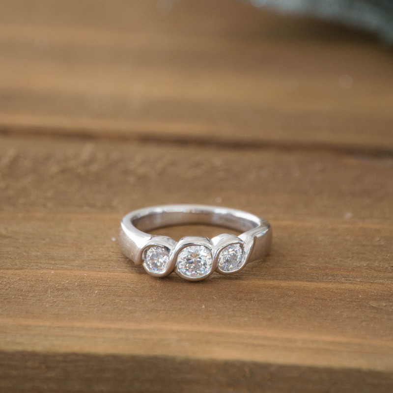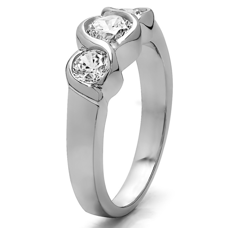 This wedding ring features 3 round bezel set stones with a 2 millimeter wide band. The total combined carat weight of the ring is 0.75 carats. It has a high profile, so it can easily be worn on its own as an anniversary wedding band or with an engagement ring. This wedding ring weighs approximately 6.75 grams.