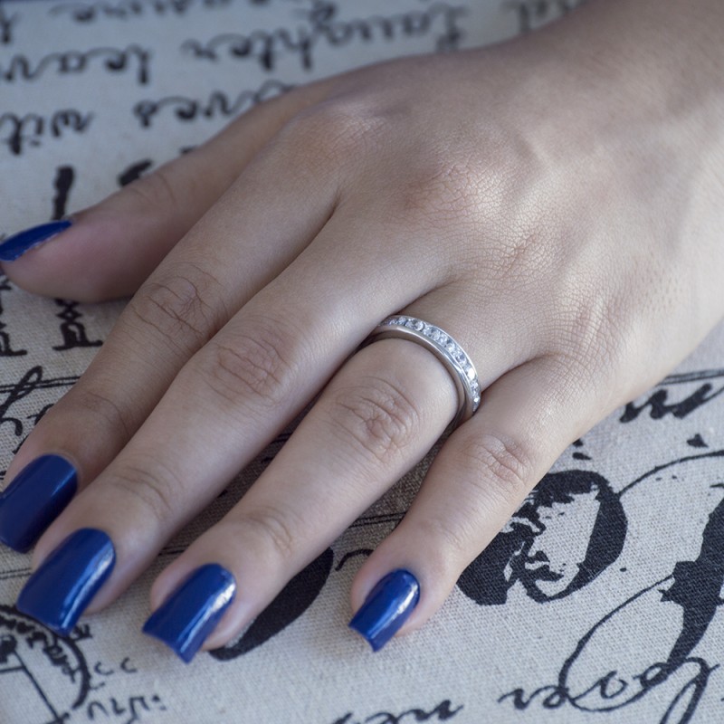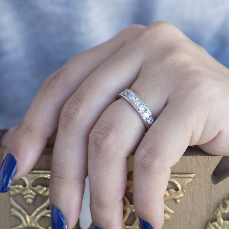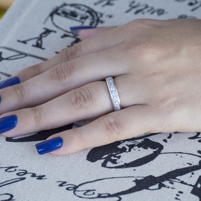 This wedding ring features 12 round channel set stones with a 2 millimeter wide band. The total combined carat weight of the ring is 0.75 carats. It has a high polish finish. This wedding ring weighs approximately 3.52 grams.