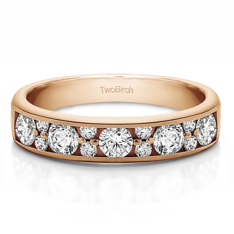 This wedding ring features 13 round channel set stones with a 2 millimeter wide band. The total combined carat weight of the ring is 0.76 carats. It has large round stones accented with smaller stones in between. This wedding ring weighs approximately 4.95 grams.