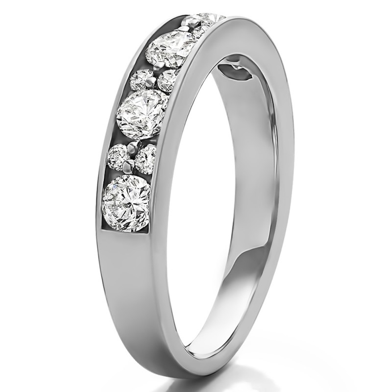 This wedding ring features 13 round channel set stones with a 2 millimeter wide band. The total combined carat weight of the ring is 0.76 carats. It has large round stones accented with smaller stones in between. This wedding ring weighs approximately 4.95 grams.