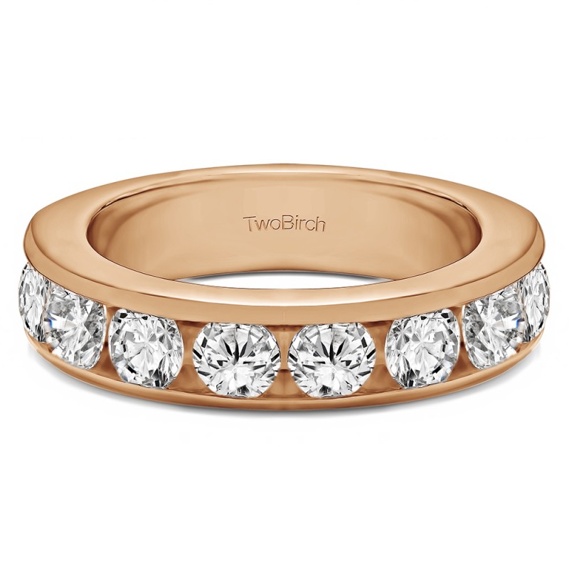 This wedding ring features 8 round channel set stones with a 2 millimeter wide band. The total combined carat weight of the ring is 2 carats. It has a high polish finish. This wedding ring weighs approximately 8.62 grams.
