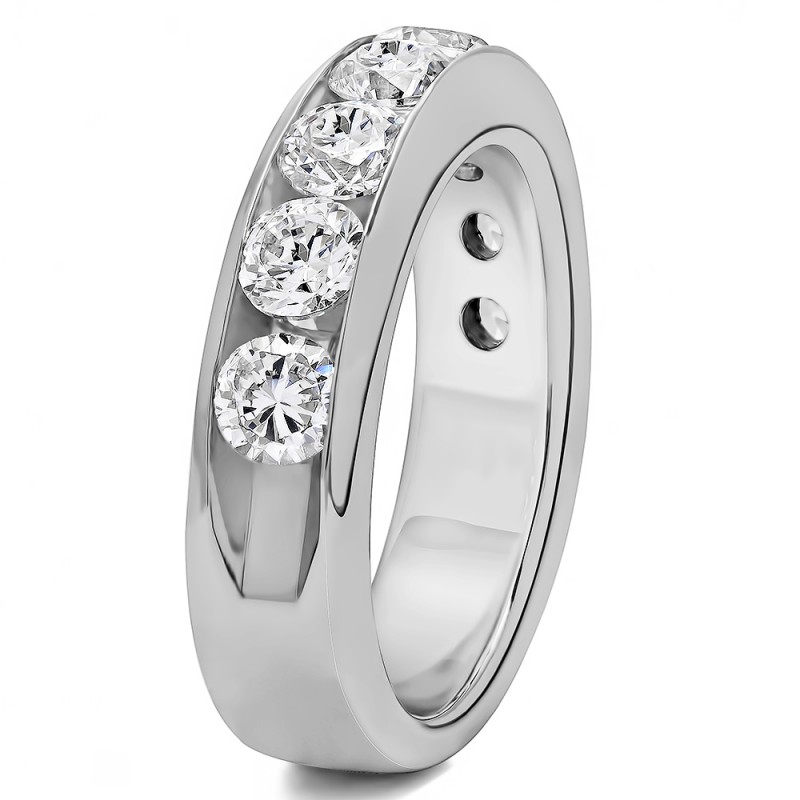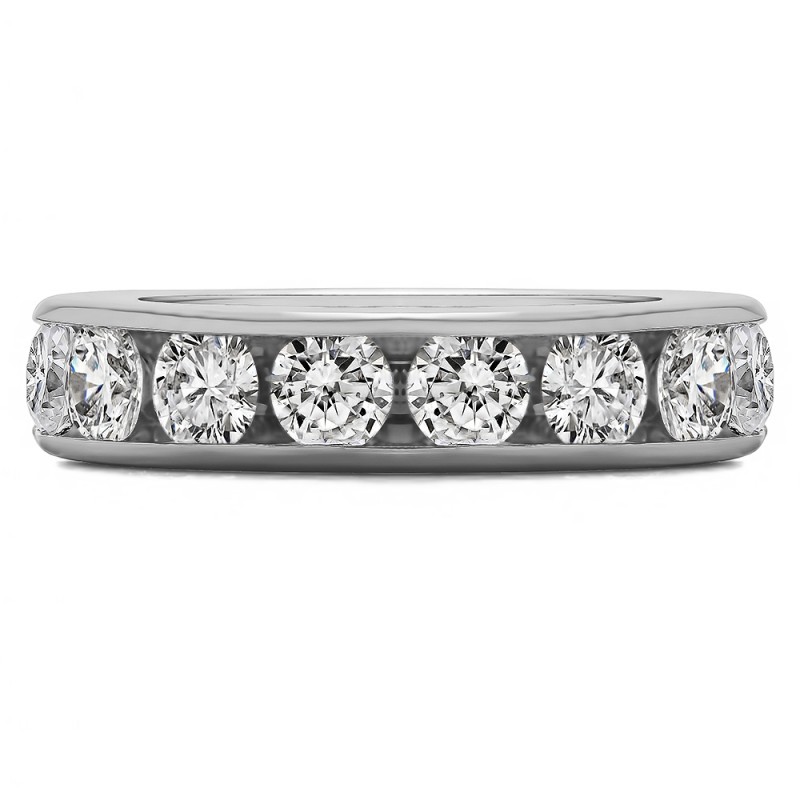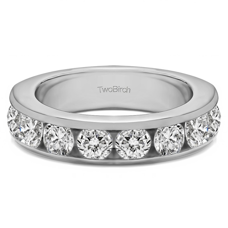 This wedding ring features 8 round channel set stones with a 2 millimeter wide band. The total combined carat weight of the ring is 2 carats. It has a high polish finish. This wedding ring weighs approximately 8.62 grams.