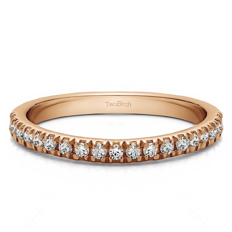 This wedding ring features 20 round prong set stones with a 2 millimeter wide band. The total combined carat weight of the ring is 0.1 carats. It has a unique French cut style setting. This wedding ring weighs approximately 1.96 grams.