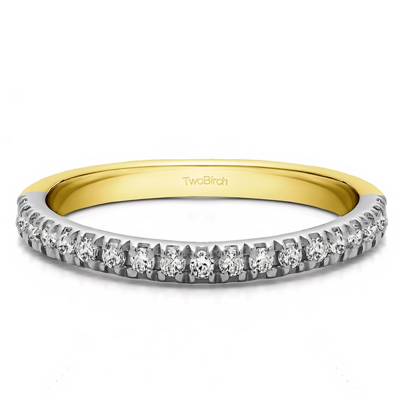This wedding ring features 20 round prong set stones with a 2 millimeter wide band. The total combined carat weight of the ring is 0.1 carats. It has a unique French cut style setting. This wedding ring weighs approximately 1.96 grams.