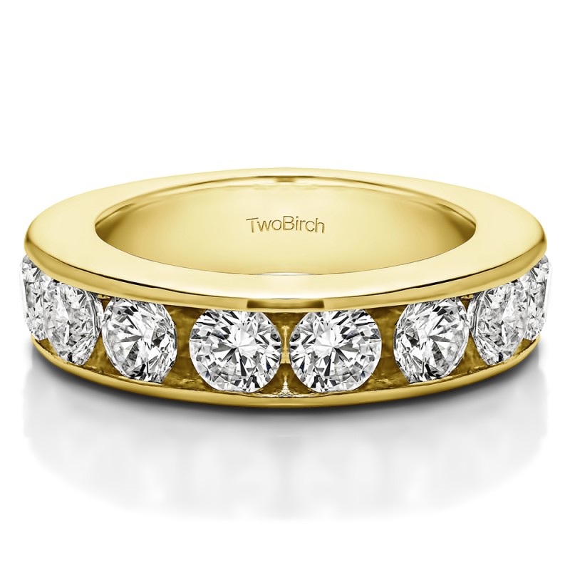 This wedding ring features 10 round channel set stones with a 2 millimeter wide band. The total combined carat weight of the ring is 0.25 carats. It has a channel set design with millgrained edges. This wedding ring weighs approximately 3.59 grams.