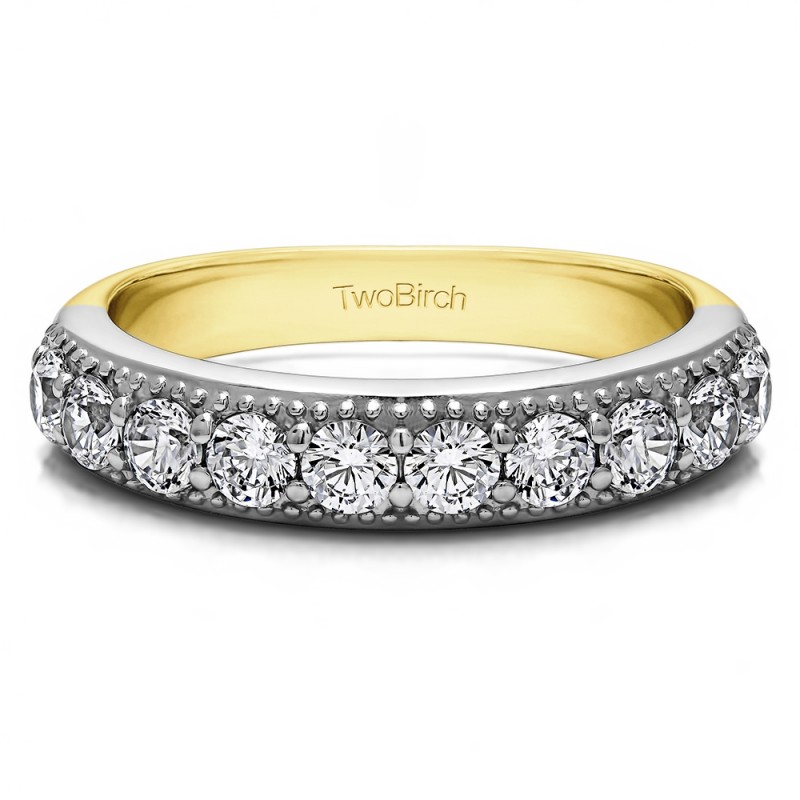 This wedding ring features 11 round prong set stones with a 2 millimeter wide band. The total combined carat weight of the ring is 0.25 carats. It features a small row of millgraining on each side of the band. This wedding ring weighs approximately 4.48 grams.