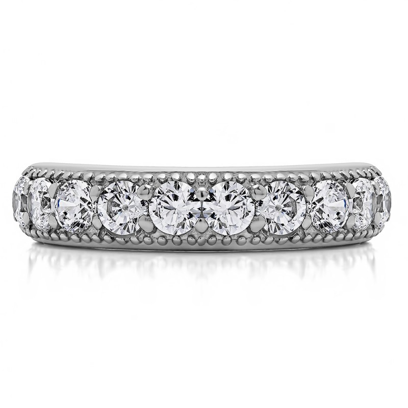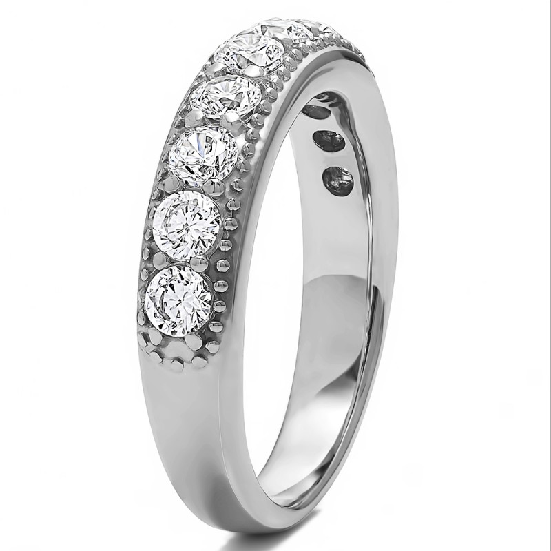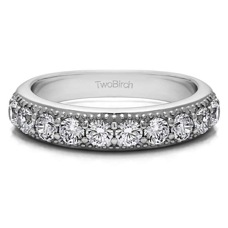 This wedding ring features 11 round prong set stones with a 2 millimeter wide band. The total combined carat weight of the ring is 0.25 carats. It features a small row of millgraining on each side of the band. This wedding ring weighs approximately 4.48 grams.
