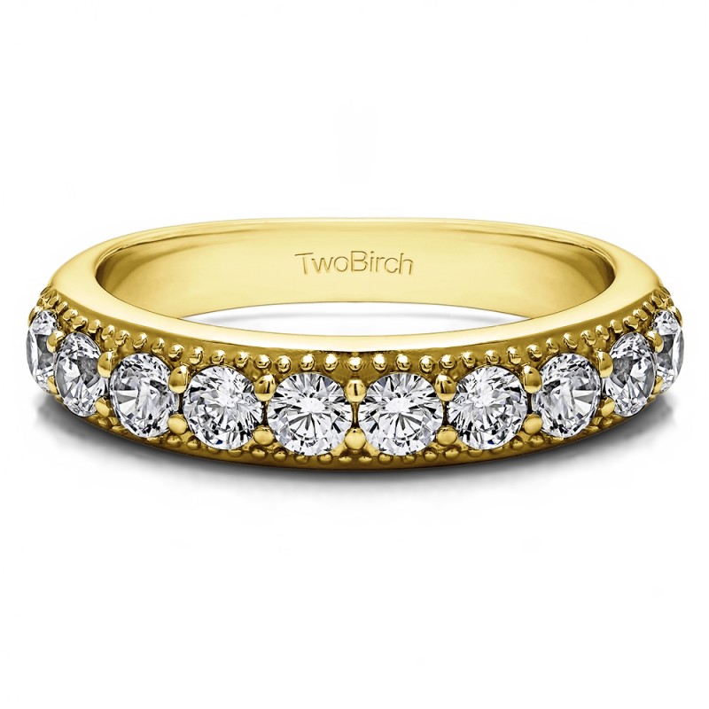 This wedding ring features 11 round prong set stones with a 2 millimeter wide band. The total combined carat weight of the ring is 0.25 carats. It features a small row of millgraining on each side of the band. This wedding ring weighs approximately 4.48 grams.