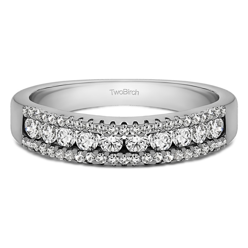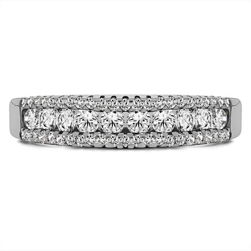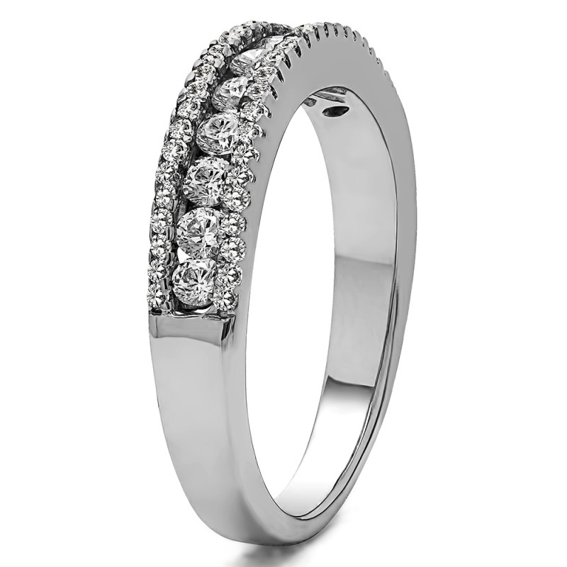 This wedding ring features 60 round prong set stones with a 2 millimeter wide band. The total combined carat weight of the ring is 0.6 carats. It has one large row of stones with smaller stones on each side. This wedding ring weighs approximately 4.64 grams.