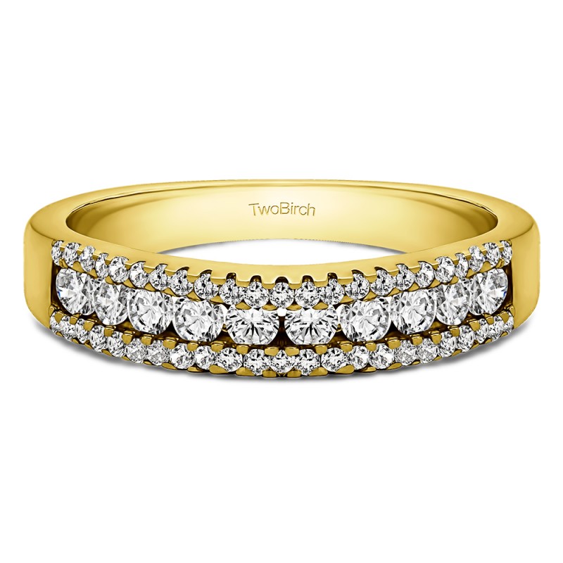 This wedding ring features 60 round prong set stones with a 2 millimeter wide band. The total combined carat weight of the ring is 0.6 carats. It has one large row of stones with smaller stones on each side. This wedding ring weighs approximately 4.64 grams.