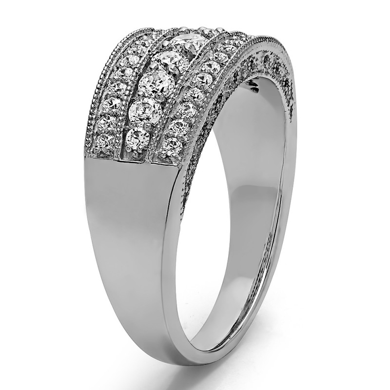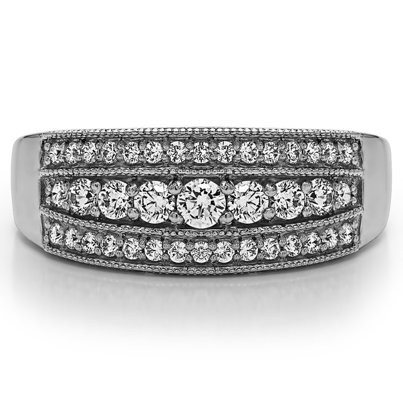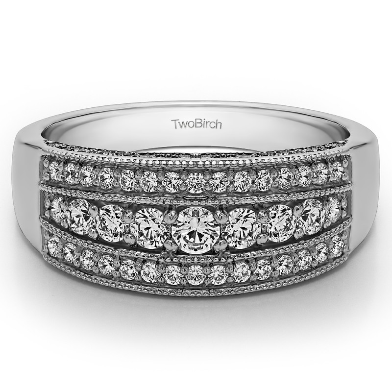 This wedding ring features 39 round prong set stones with a 2 millimeter wide band. The total combined carat weight of the ring is 0.71 carats. It has one wide row of stones surrounded by one row of smaller stones on each side and millgrained edges. This wedding ring weighs approximately 11.82 grams.