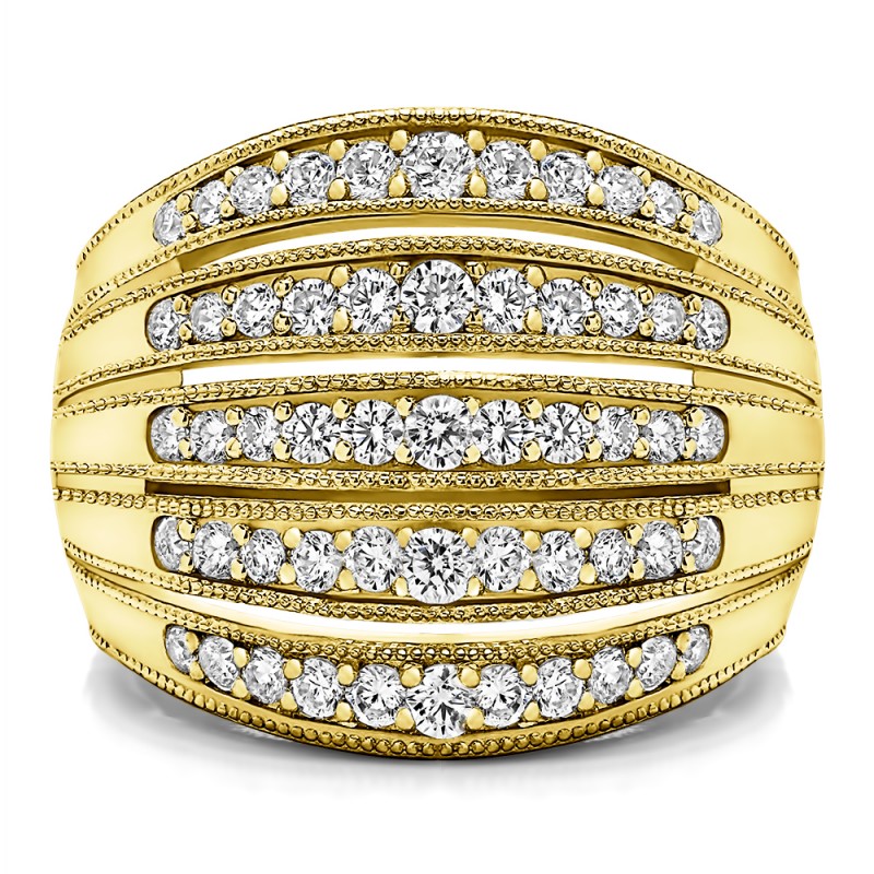 This wedding ring features 55 round prong set stones with a 2 millimeter wide band. The total combined carat weight of the ring is 0.75 carats. The band is very wide and has a domed design with five rows of stones. This wedding ring weighs approximately 10.85 grams.
