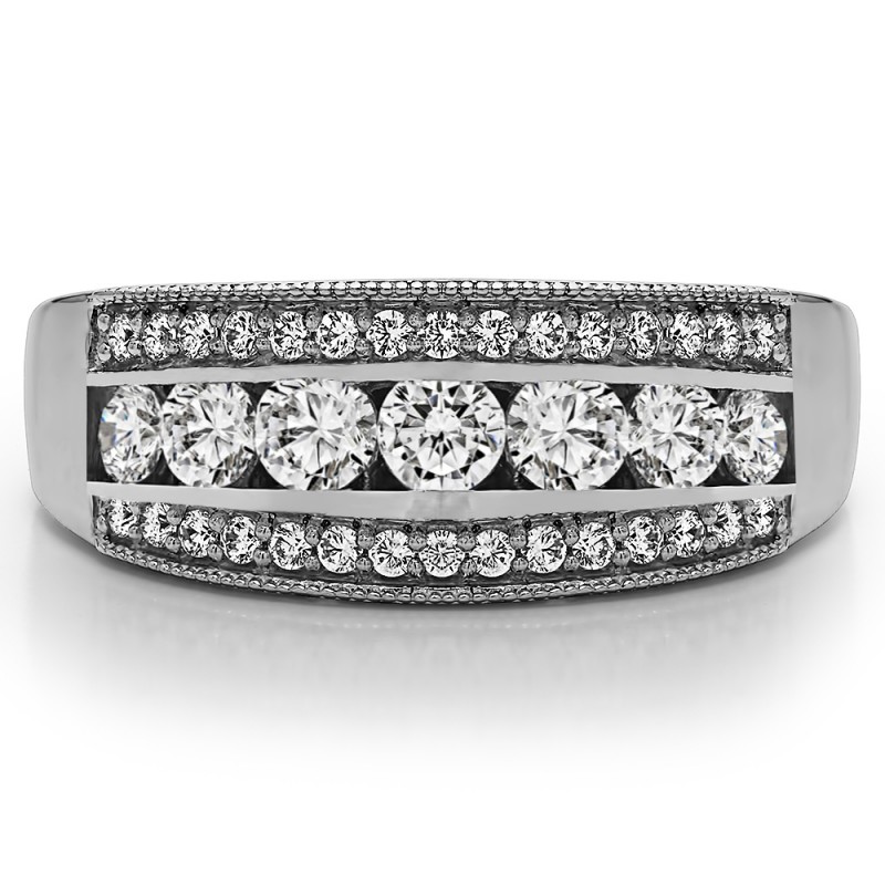 This wedding ring features 39 round channel set stones with a 2 millimeter wide band. The total combined carat weight of the ring is 0.98 carats. It has three rows of stones, channel and prong set with millgrained edges. This wedding ring weighs approximately 8.24 grams.
