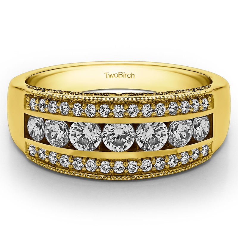 This wedding ring features 39 round channel set stones with a 2 millimeter wide band. The total combined carat weight of the ring is 0.98 carats. It has three rows of stones, channel and prong set with millgrained edges. This wedding ring weighs approximately 8.24 grams.