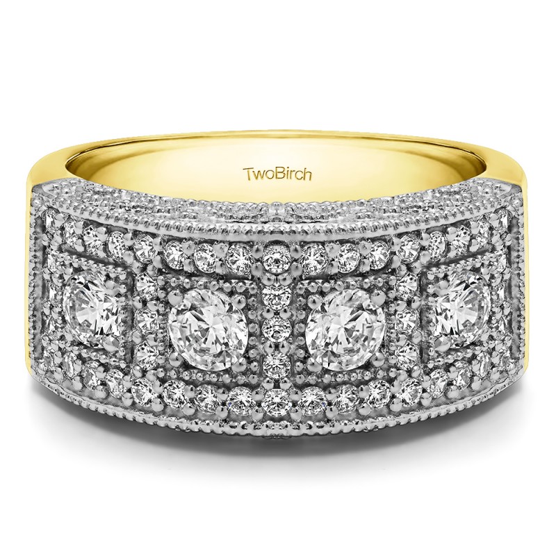 This wedding ring features 53 round prong set stones with a 2 millimeter wide band. The total combined carat weight of the ring is 1.01 carats. It has four larger stones with smaller stones surrounding them. It also features millgrained edges and filigree design. This wedding ring weighs approximately 10.76 grams.