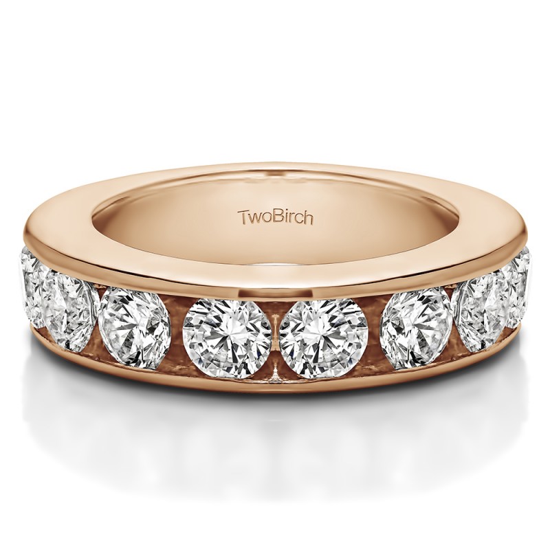 This wedding ring features 10 round channel set stones with a 2 millimeter wide band. The total combined carat weight of the ring is 1 carats. It has a channel set design with millgrained edges. This wedding ring weighs approximately 5.32 grams.