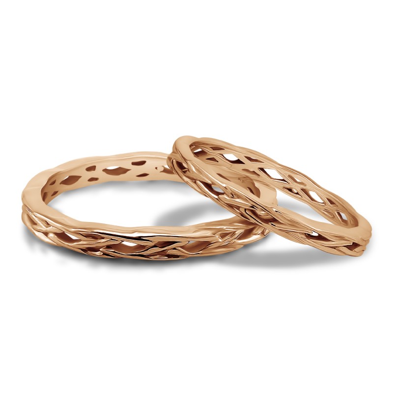 This is a two ring set which features a wider and thinner wedding. This Celtic infinity braided women's ring features a braided design and measure about 2.5 millimeters in width. The men's ring is about 3.8 mm wide. The design is eternity, which means it goes all the way around the band. This ring is solid, not hollow, making it sturdy and perfect to last a lifetime of daily wear.